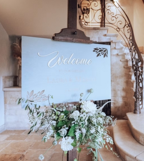 Real-life voorbeeld: Voor een modern bruidspaar werd een bloemendecor gecreëerd in een warm perzikkleurig palet. Dahlia’s, amaranthus en zonnehoeden werden zorgvuldig gecombineerd om een harmonieus en ton-sur-ton geheel te vormen. Dit kleurenpalet werd doorgetrokken in de styling, met onder andere een welkomstbord in bijpassende tinten. Het resultaat? Een gestileerde, monochrome look die rust en elegantie uitstraalt.