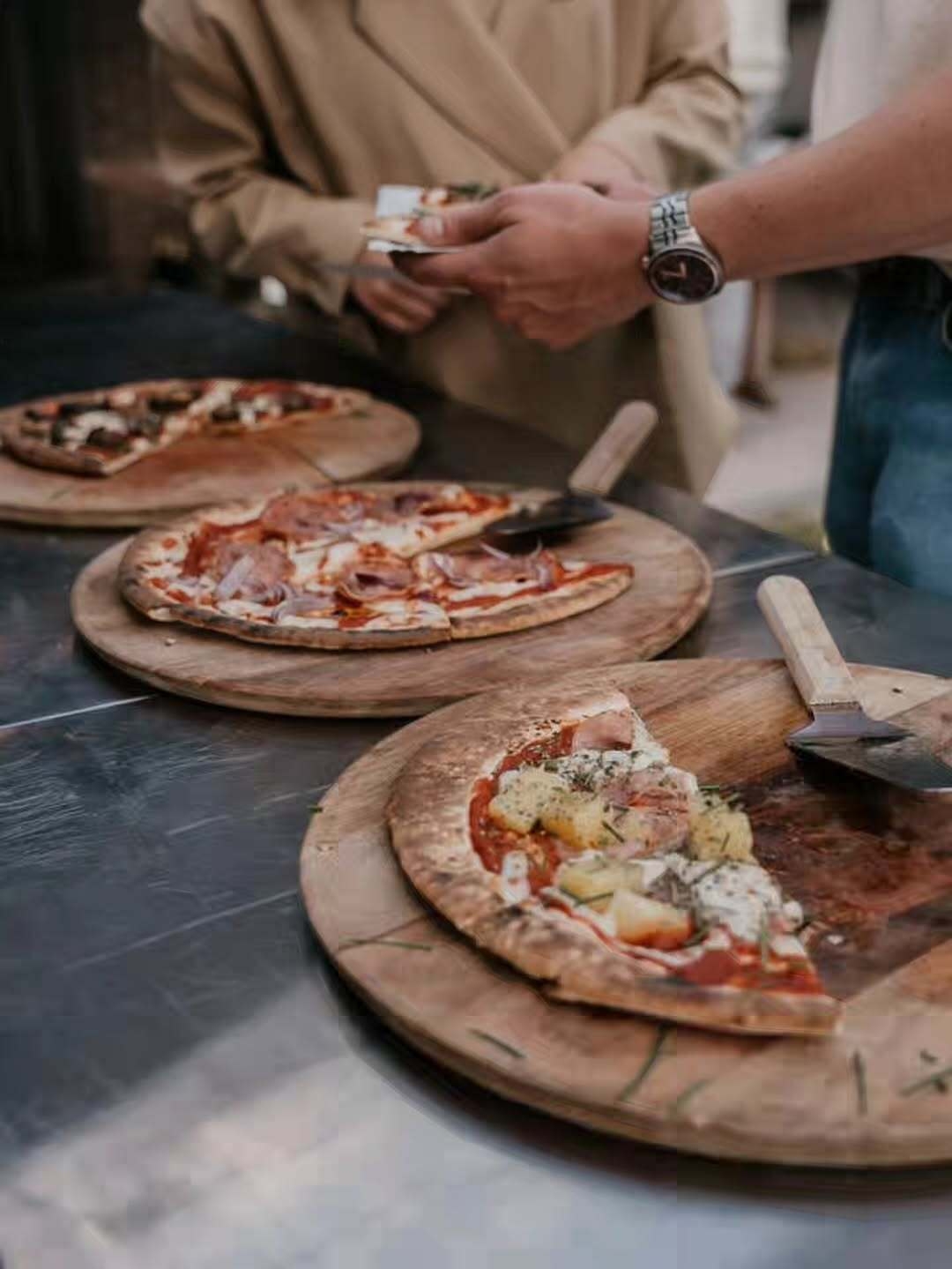 Om ervoor te zorgen dat we aan al uw wensen voldoen, vragen we om op voorhand te laten weten hoeveel pizza's u nodig heeft. Meestal is dit 1 pizza per persoon. Uw genodigden kunnen doorlopend de verschillende smaken proeven.