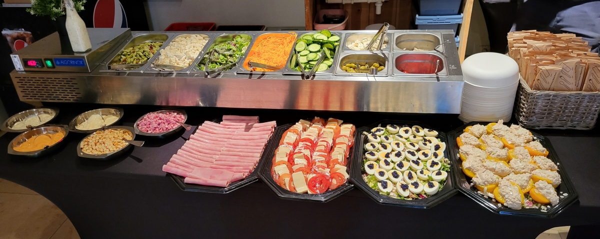- Create your own hamburger à volonté (keuze uit sla, uitjes, tomaat, komkommer, cheddar): € 13,25 p.p.