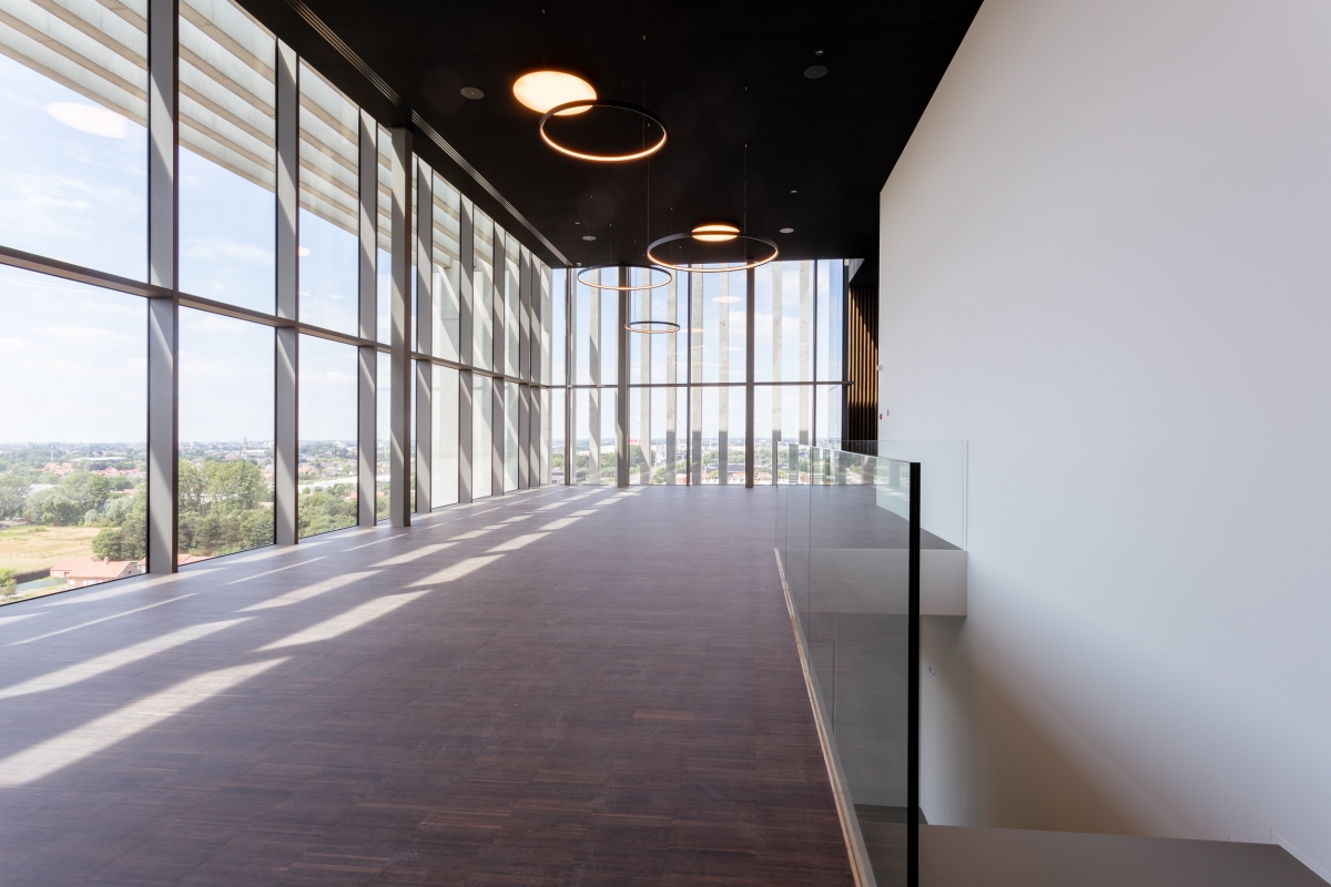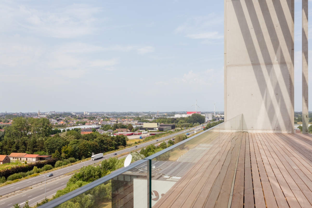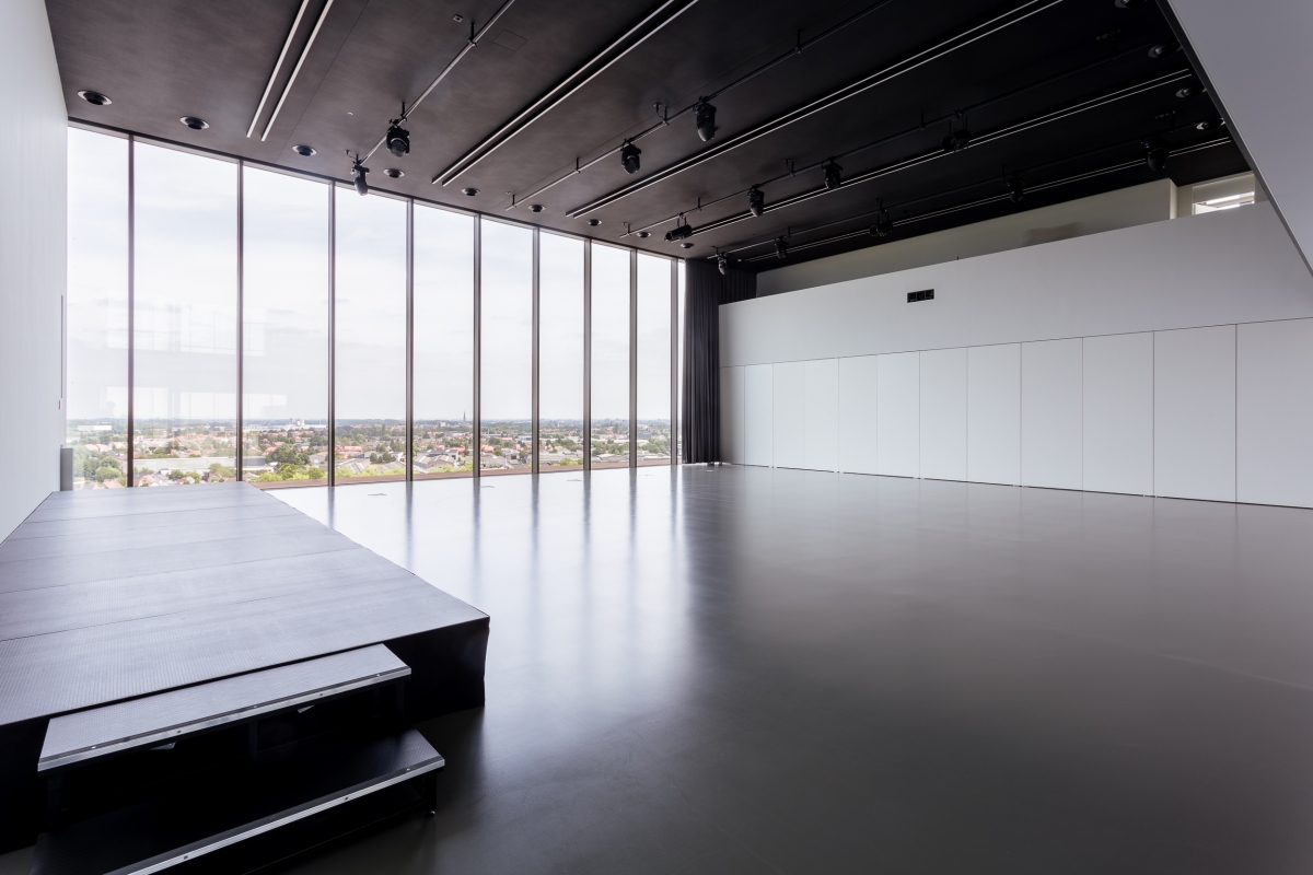 Deze eventruimte met een maximumcapaciteit van 200 personen heeft een volledig uitgeruste licht- en geluidsinstallatie en is dus ook uiterst geschikt als seminarieruimte. De vele hoge glaspartijen laten je vanop 40 meter hoogte genieten van het unieke uitzicht op Izegem en de wijde omgeving.