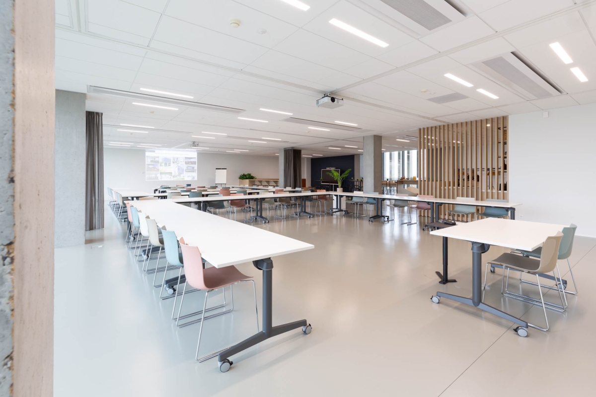 De trainingsruimte is een multifunctionele zaal die plaats biedt aan maximaal 48 personen in klas-of U-opstelling. Je beschikt er over een projector met een helderheid van 6000 lumen en een volledig uitgeruste geluidsinstallatie met draadloze microfoons, perfect voor het geven van kwalitatieve opleidingen, presentaties, enz.