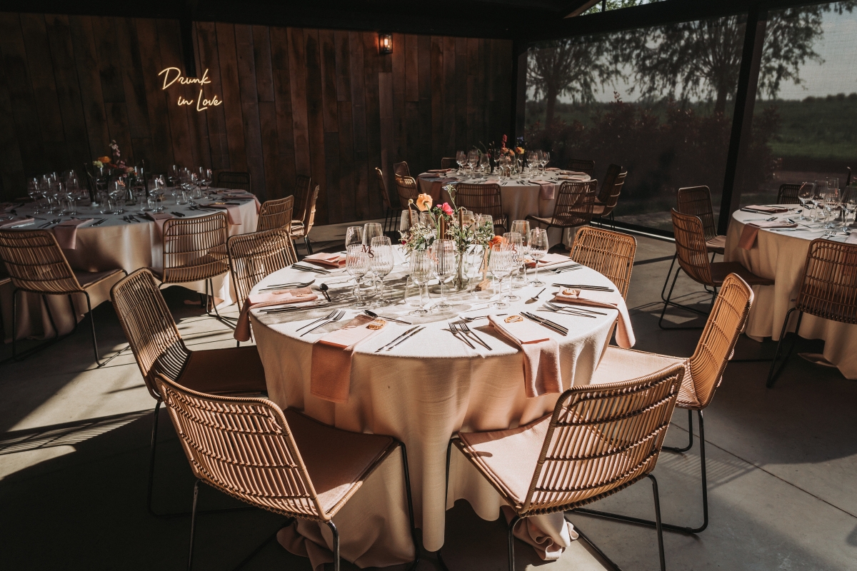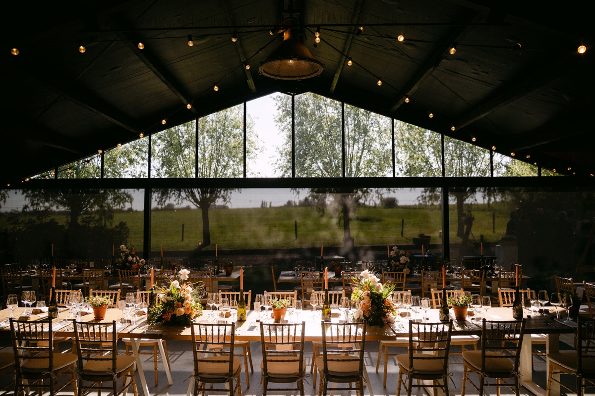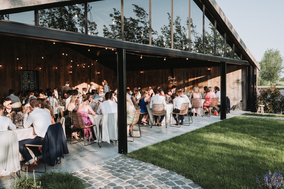 Ons overdekt terras met zicht op de velden is uitermate geschikt voor ceremonie, receptie of diner. Aanbouwen van een tent is mogelijk.