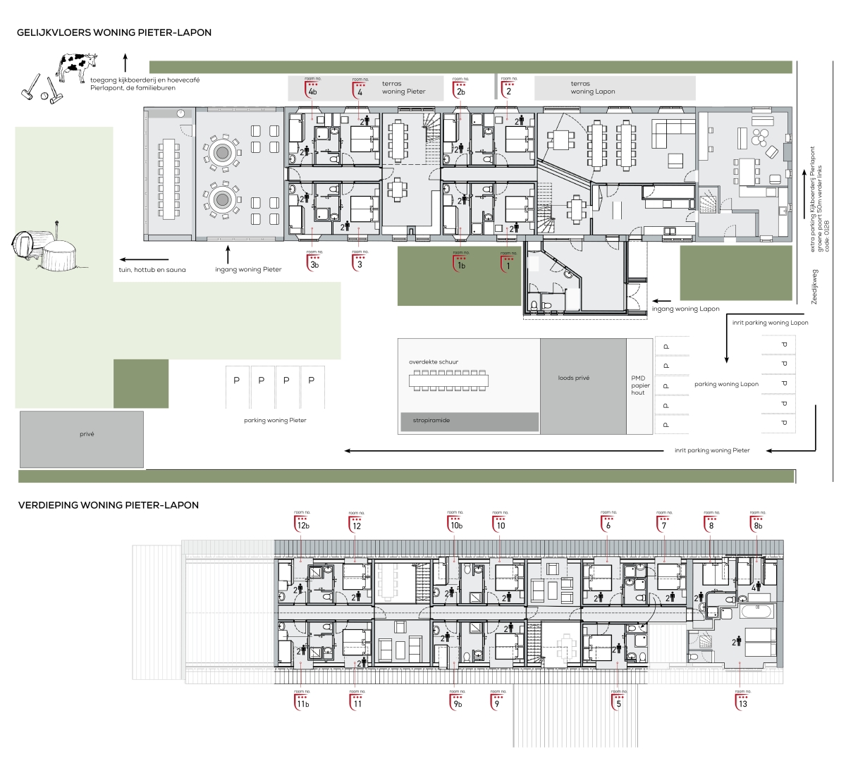 - 22 kamers, 13 badkamers, 15 wc’s
