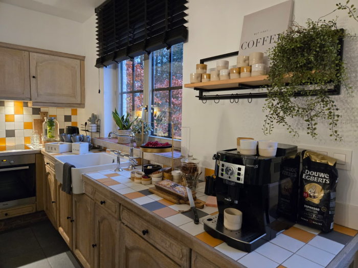 Vestiaire - ruime woonkamer met grote tafel - cosy zithoek met zicht op groen - ruime leefkeuken - weidse tuin - terras met grote tuintafel - zwemvijver - wijngaard, alsook de beamer, flipchart en wifi