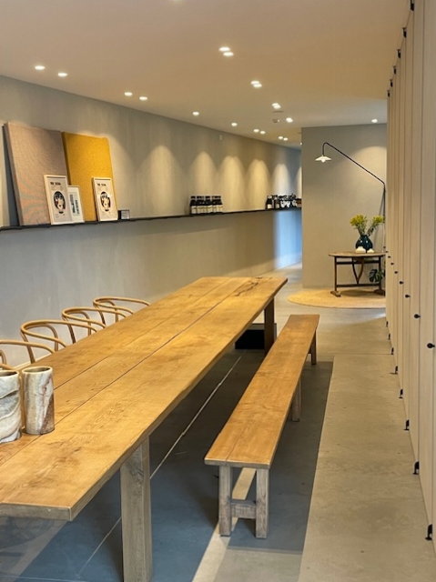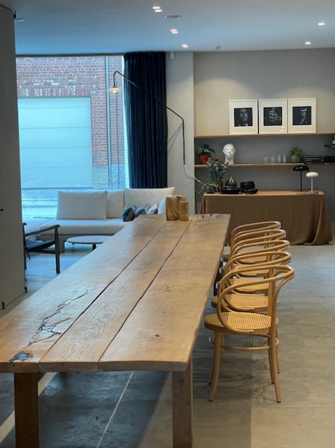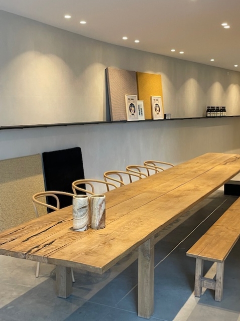 Wij hebben een ruimte met daarin centraal een prachtige grote houten tafel met een lengte van 6 m en voor max. 20 personen.