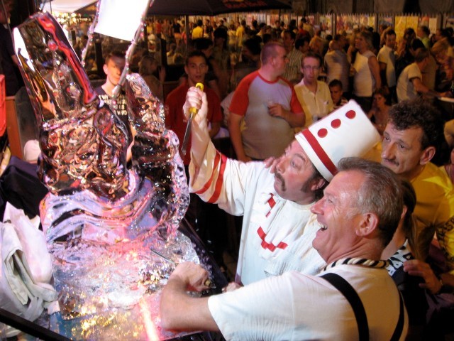 - IJssculpturen – live uitgesneden met , zaag en beitel , ook een ijsbar , vodkaluge of logo. Ook uw product invriezen als eye - catcher , op een beurs , steeds een groot succes . Of een wedstrijd waar de mensen moeten raden wanneer een item uit een blok zal gesmolten ( Q music)